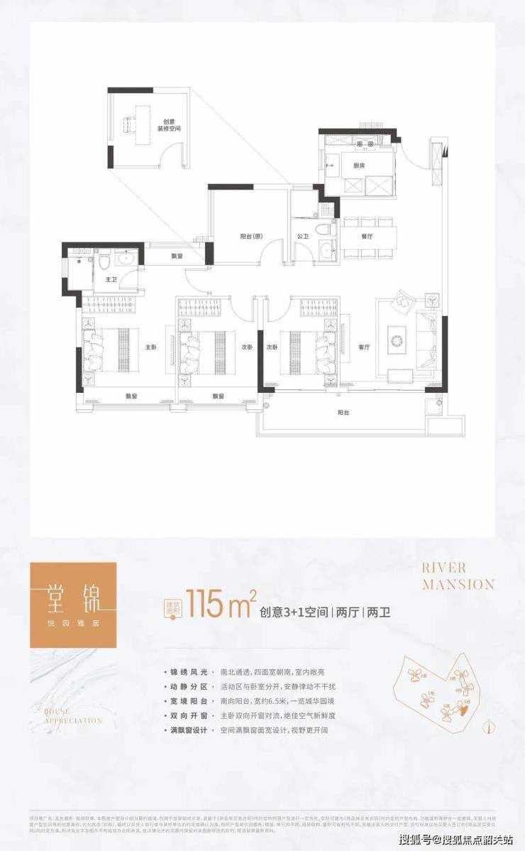 115㎡堂锦3+1户型:南北通透,通风良好,带有宽敞的观景阳台。