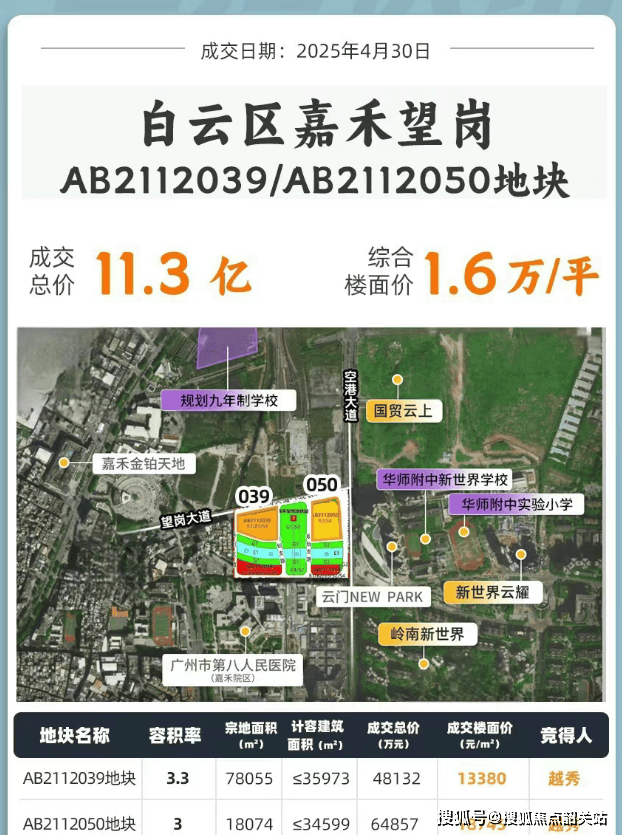 2025年4月30日,越秀地产在土拍市场成功竞得嘉禾望岗两个地块——AB2112050和AB2112039地块,楼面价分别为1.87万/㎡和1.34万/㎡。这两个地块的获得标志着嘉禾望岗区域将迎接新的发展篇章。