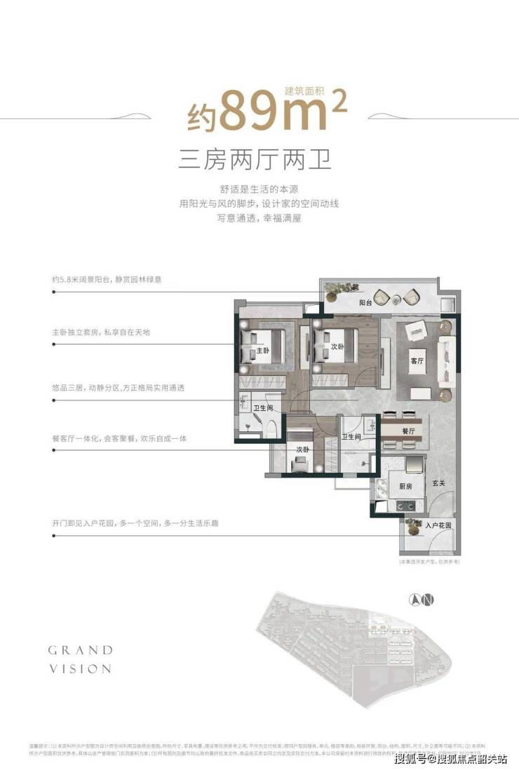 89㎡金牌上车三房:三房两厅两卫,5.8米阔景阳台,主卧独立套房,布局合理,刚需首选。