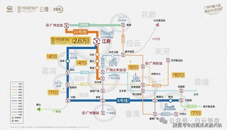 双地铁交汇:项目最大的交通利好来自于在建的广州地铁8号线北延段(及支线)江府站。根据广州市发改委及广州地铁官方公示的工程进度,该线路正在全力推进中(预计2027-2028年通车)。江府站距离项目约500米,属于标准的地铁上盖/准地铁盘。通车后,6站可达白云新城,无缝接驳2号线、14号线,极大拉近与天河、越秀的通勤距离。