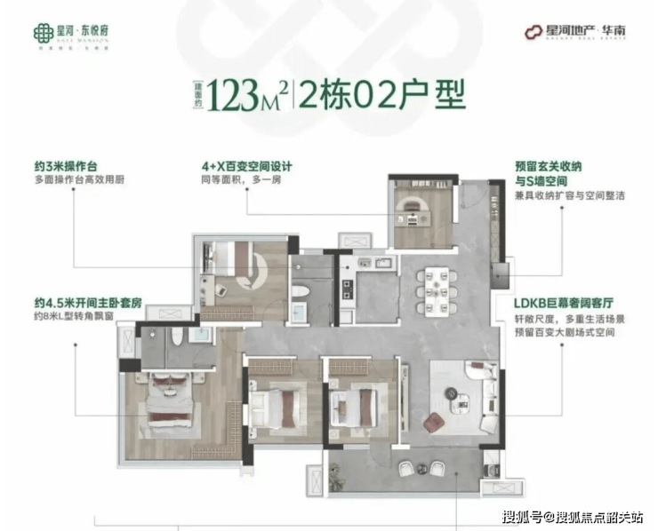 星河东悦府由星河控股开发,秉承“以人为本、宜居优先”的社区理念,致力于为南沙区府板块购房者打造高舒适度、高实用率的居住环境。项目涵盖89-138㎡多种四房产品,设计亮点包括可砸全赠送飘窗、超高使用率户型以及南北通透布局,让空间利用率达到128%,同等面积相比市场其他产品多出一房,满足刚需和改善型家庭的多元需求。住宅户型布局兼顾采光、通风和储物功能,体现现代居住美学。
