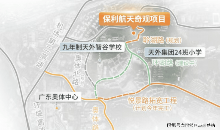 该项目最大的优势之一是教育资源。根据规划,社区内部将配建一所6班制幼儿园,同时小学与初中学位由天河外国语智谷学校统筹,该校为九年一贯制名校,分设两个小学校区,学位相对充足且教育质量较高。商业方面,项目自身暂无大型商业体,但可共享周边保利天汇与越秀观樾的社区商业,未来越秀观樾规划约1万平方米的滨湖商业,涵盖精品超市、特色餐饮、生活配套与教育培训等业态,可满足业主日常所需。医疗资源方面,步行范围内医疗设施有限,但3公里范围可达广州医科大学附属中医院与黄村医院,同时车程十分钟左右可抵达中山三院岭南医院,医疗条件完善。休闲资源方面,项目临近月亮湖、太阳湖与映辰湖,结合周边山体与人工绿地,打造出天河东部少见的山水相依的生态人居环境。