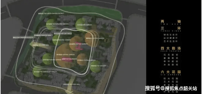 项目园林已实景呈现,采用“一轴两环三心”布局: