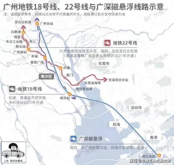 广深高速磁悬浮预留线路将从广州东站引出,途径南沙,跨过珠江口后进入深圳宝安和前海,最后直入香港西九龙。