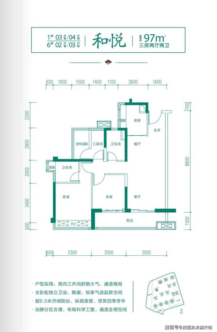 82平方米刚需实用三房:南北对流,拥有约3.4米阳台,采光面大。