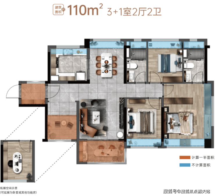 户型多样,有建面约 76㎡的 2 + 1 室 2 厅 1 卫87㎡的 2 + 1 室 2 厅 2 卫、98㎡的 3 + 1 室 2 厅 2 卫以及 110㎡的 3 + 1 室 2 厅 2 卫。