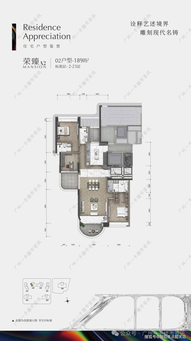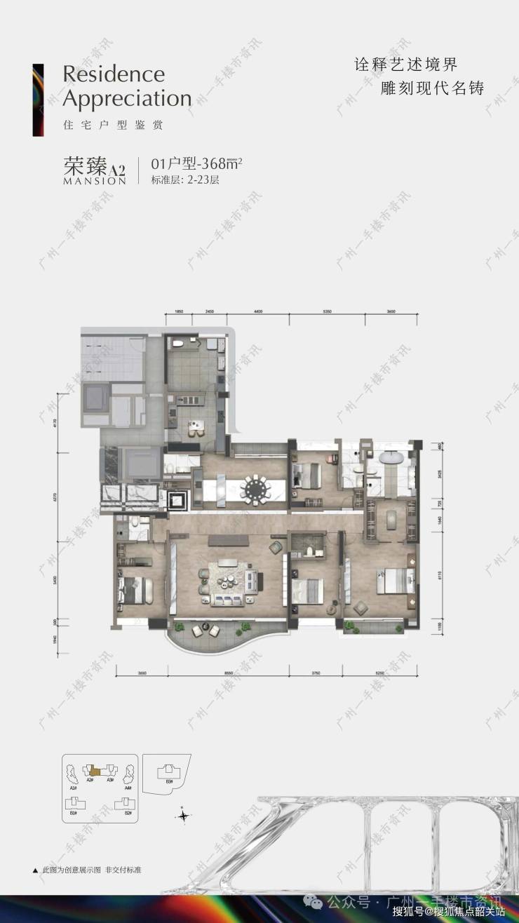 目前,合景臻溋名铸的住宅部分主要在售A2、A3栋的189㎡三房户型和368㎡四房户型,以及A4栋少量现楼的267-280㎡四房户型。公寓部分则主要在售B1、B2栋的322-405㎡四房户型和B3栋的500-532㎡四房户型。每一个面积段的产品,都针对不同的家庭结构和生活方式进行了精准定位,力求满足各类高端客户的需求。