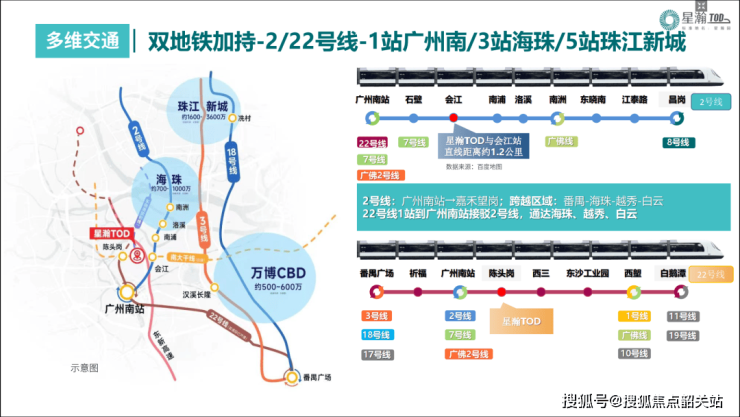 交通是越秀·星瀚TOD的一大亮点。项目是在建22号线地铁陈头岗站上盖项目,真正实现了地铁上盖的便捷出行。搭乘22号线,1站即可抵达广州南站,3站到达广钢,5站直通珠江新城,轻松融入城市核心区域的生活圈。此外,项目虽目前距离2号线地铁会江站约1.8公里,但邻近2号线,乘坐2号线3站可到海珠,进一步拓展了出行的便利性。