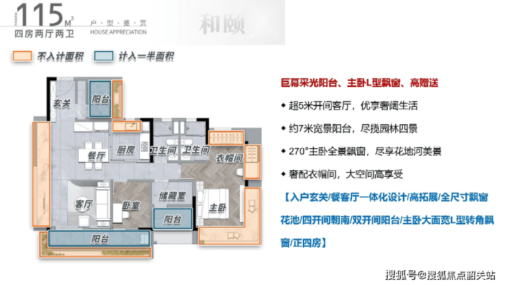 115方户型:多房朝南厅出大阳台,南北对流设计,空气流通良好。
