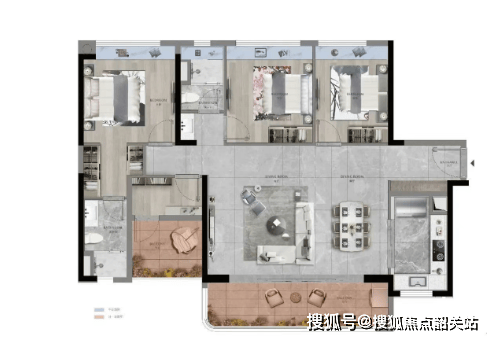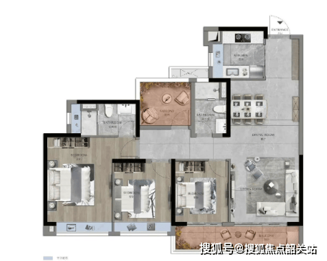 120㎡三房两厅两卫,约13米西南向四面宽,全明采光,有6.5米阳台,尽揽园林胜景。