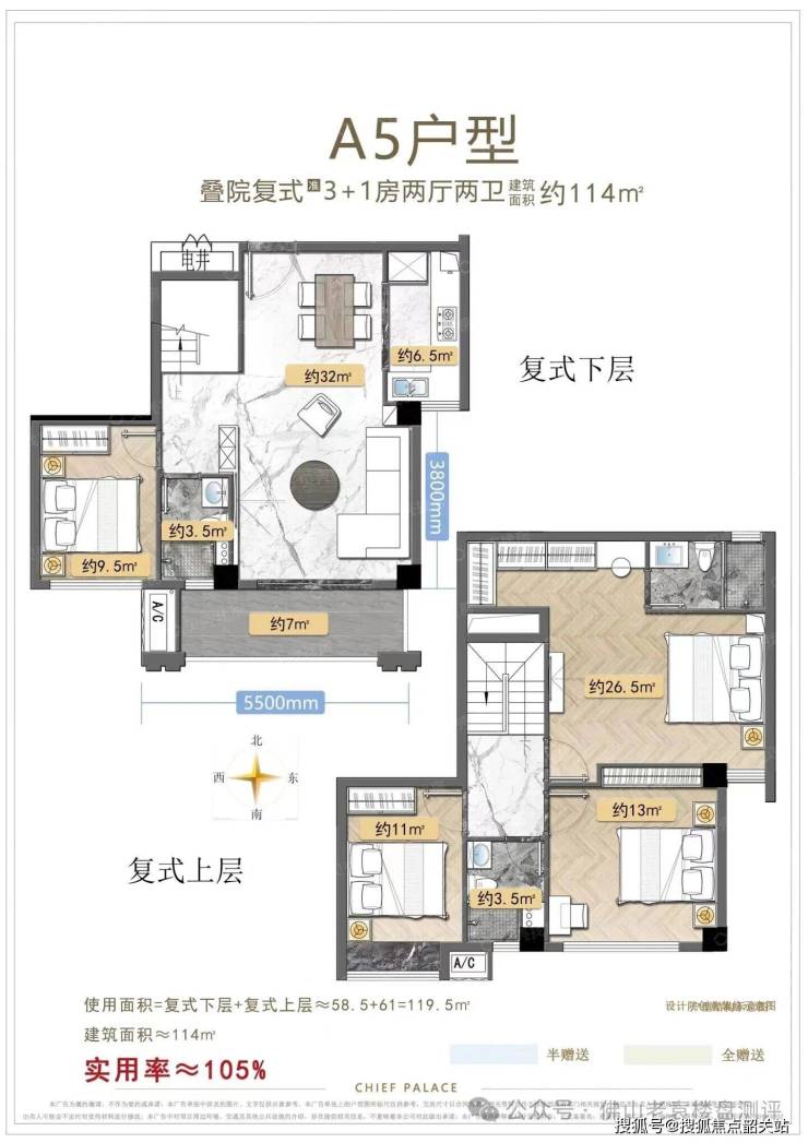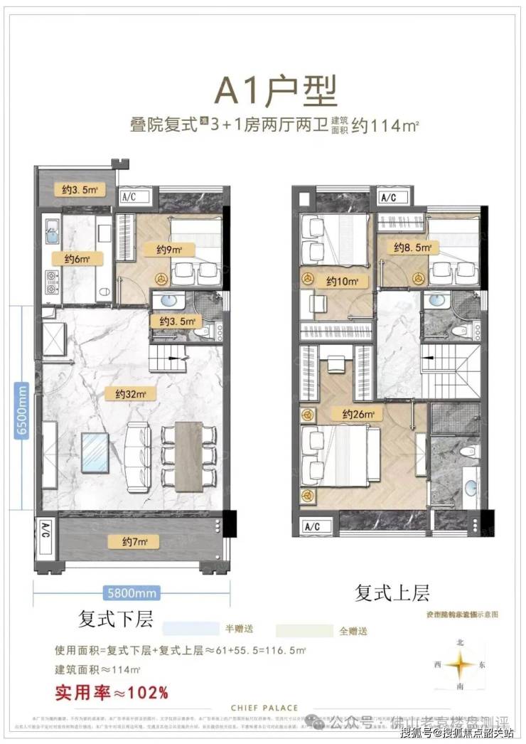 114㎡复式户型则更加奢华大气。南北通透的双阳台设计,让室内光线充足,空气流通。6米挑高的客厅更是点睛之笔,既提升了空间的视觉高度,又增加了空间的层次感。您可以选择保留中空设计,打造气派的中空客厅,彰显主人的品味与格调;也可以选择全封做五房,满足多孩家庭或三代同堂的居住需求。双主卧套房设计,让每位家庭成员都能享受到尊贵的居住体验。