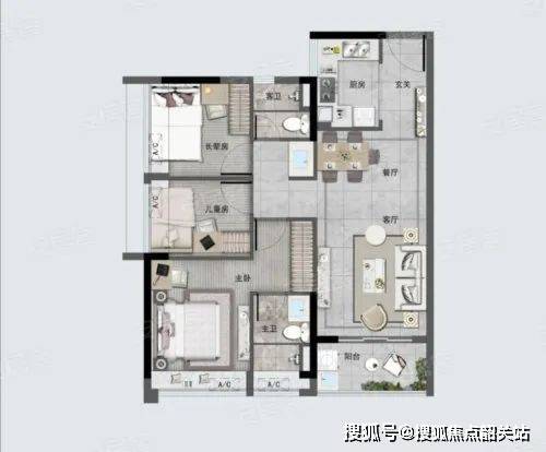 户型设计更是精益求精,主力产品为66-166㎡二至四房,满足不同家庭结构的居住需求。以75㎡三房为例,该户型采用“动静分区”设计,客厅、餐厅与阳台一线贯通,延展空间视野;三间卧室均朝南向,采光充足,最小卧室面积超6㎡,可作为儿童房或书房,空间利用率极高。97㎡四房户型则创新性地将空间优化,主卧套房设计配备独立卫浴和衣帽间,次卧可根据需求改造成书房或儿童房,灵活多变的空间布局,完美适配二胎家庭或三代同堂的居住需求。