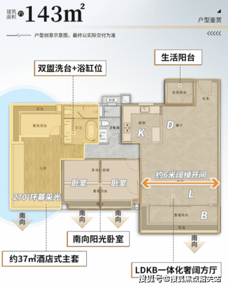 建面143㎡四房两卫空间阔绰,配置独立玄关库与U型厨房,收纳空间充足,总价约715万起,适配改善家庭长期居住需求。