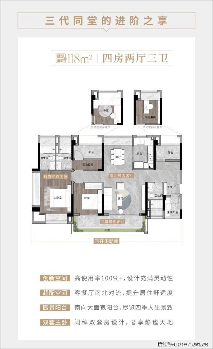 A: 最佳户型为118㎡四房,得房率125%,空间布局合理,采光充足,适合改善型需求。