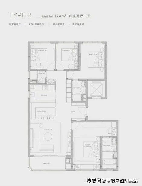 174㎡四房三卫:端户边厅设计,270度环幕观景阳台,主次双套房配置,满足家庭成员的不同需求。