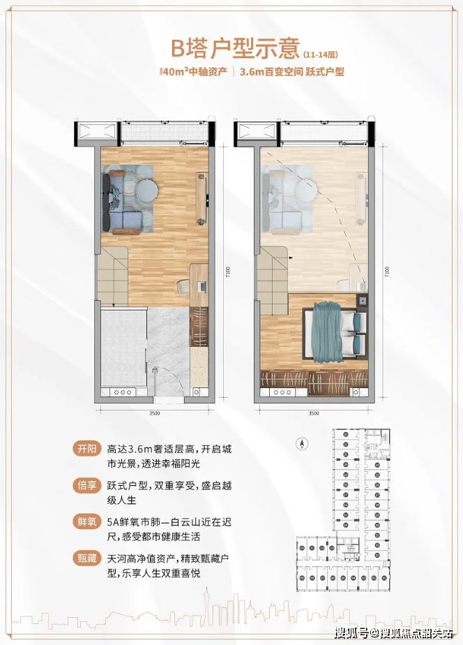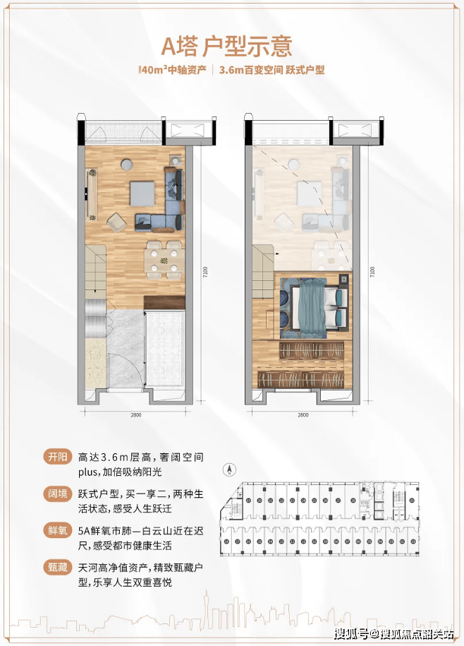 推售建筑面积约为36-43平方米的酒店行政公馆及31-54平方米的中轴精品空间,合理规划卧室、厨房、卫生间,采用3.4-3.6米高的超高空间设计,适合自用、办公或投资等多种需求。