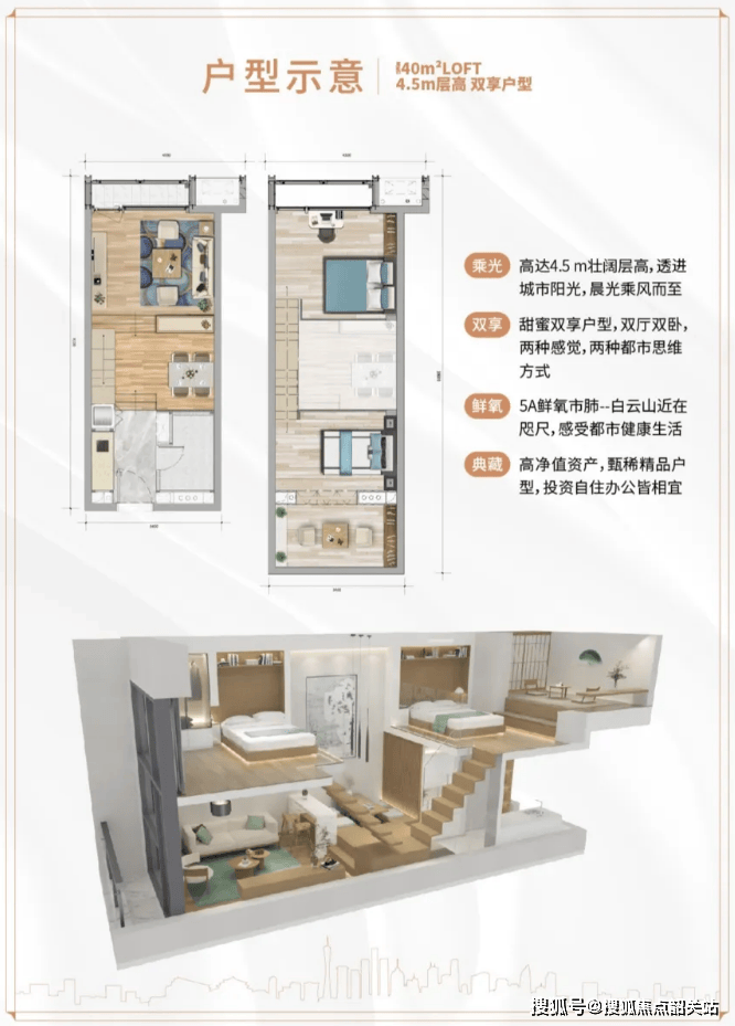 推售建筑面积约为31-57平方米的中轴资产,合理规划卧室、厨房、卫生间,采用4.5米高的超高空间设计,中空挑高设计,带来墅级享受。