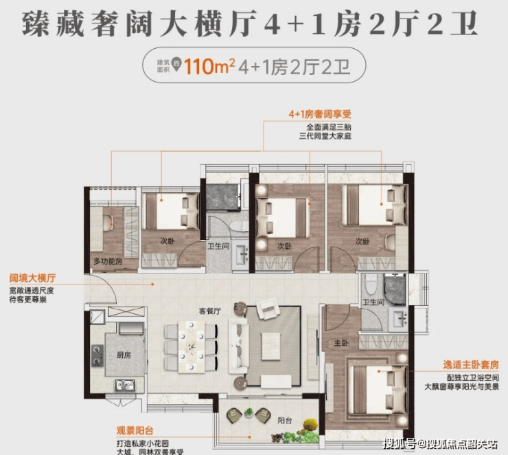 110平米五房两厅两卫:打造私家小花园,全面满足三胎或三代同堂大家庭需求。