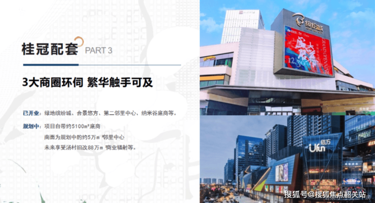 周边商业配套成熟,已开业的有绿地缤纷城、合景悠方、第二邻里中心、纳米谷底商等,项目南面还规划有约 5 万㎡邻里中心,未来还能享受汤村旧改 88 万㎡商业的辐射。