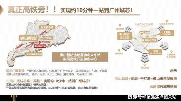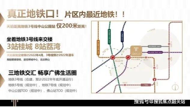 便捷交通:拥有“3地铁+2TOD+1高铁”的立体交通网络。其中,佛山地铁3号线中山公园站距离项目仅约200米,预计2022年通车后,3站可达桂城,8站到广州荔湾。此外,广湛高铁佛山站也正在规划建设中,将进一步提升项目的交通便利性。