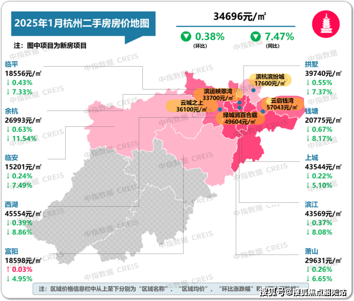 图:2025年1月杭州各市辖区二手住宅挂牌均价及环同比数据来源:中指数据CREIS(点击查看)市场监测:https://www.cih-index.com