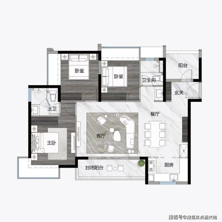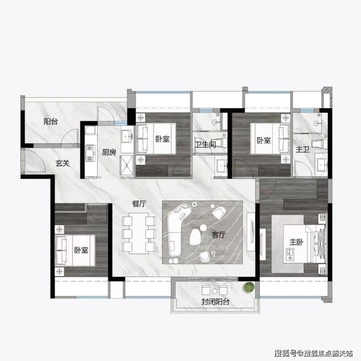 121㎡ 3+1房2厅2卫,L型入户尊崇体验,约8.1m长南北通透都荟宽厅,约5m长270°观景阳台,约46㎡豪宅式社交空间。