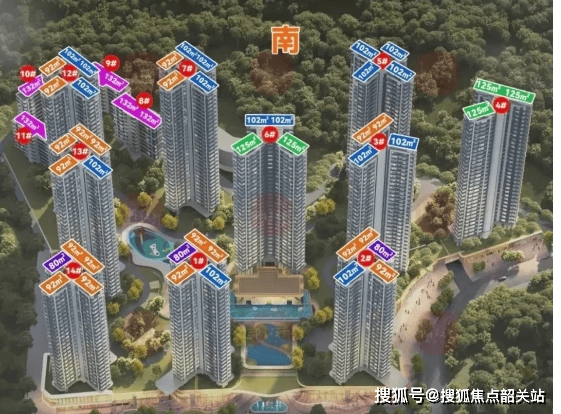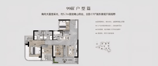 项目主打 80-132㎡户型,涵盖三房至四房,全为南向设计,部分户型东南 / 西南向看山,使用率高达 100%-110%,空间利用率优势显著。具体户型亮点十足:80㎡三房两厅两卫(东南向看山,使用率 107%,四开间南向,12.6 米超大面宽,主卧 270° 弧形玻璃幕窗);93㎡四房两厅两卫(东南向看山,使用率 109%,独立入户玄关,南北通透,四面宽视野,主卧 270° 弧形玻璃幕窗);96㎡四房两厅两卫(西南向看山,使用率 100%,约 5.7 米面宽瞰山阳台);100㎡四房两厅两卫(西南向看山,使用率 109%,南北通透,约 6.1 米巨幕阳台)。楼栋梯户比合理(6 栋 2 梯 5 户、3 栋 2 梯 4 户、1 栋 2 梯 3 户),且建筑扭转 45° 角排布,四边位采光,前后无遮挡,每户都能享三到四开间南向望山景,居住舒适度拉满。