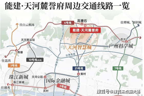 项目位于天河智慧城北部(广汕二路以南、大观北路以北),地处天河东板块,紧邻黄埔,是天河未来发展重心区域 —— 天河智慧城(GDP 占天河 47%,聚集网易、小鹏等 34 家总部企业,超 20 万人才在此工作生活)。交通出行十分便利,距离地铁 6 号线高塘石站 B 出口仅 800 米,30 分钟可直达珠江新城、金融城、琶洲三大 CBD;自驾方面,北边就是广汕二路,500 米可达广连高速,接驳广佛肇高速、广州环城高速,轻松通达广州各区,无论是通勤还是日常出行都高效便捷。