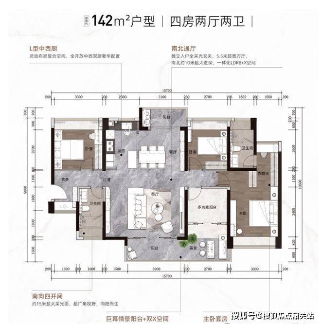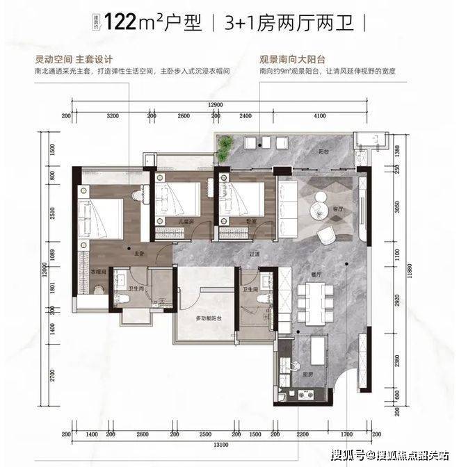 122㎡ 4 房 2 厅 2 卫 1 阳台:该户型朝南,采光极佳。采用创新的 “LDKB + X 空间” 设计理念,客厅、餐厅、厨房、阳台一体化,打造宽敞的公共活动空间,满足家庭休闲、饮宴、社交等多种功能。四房的设计可满足三代同堂或二孩家庭的居住需求,房间布局合理,动静分区,保证了居住的私密性与舒适度。客卫与主卫的设置,方便家庭成员使用。景观阳台可饱览园林或江景,增添生活情趣。