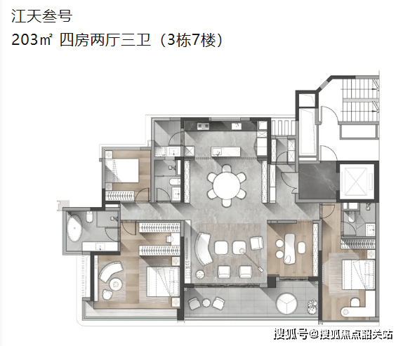 其次是203㎡的“江天叁号”户型,位于3栋7楼。虽然面积稍小,但同样做到了四房两厅三卫的阔绰格局。这款户型在设计上更加紧凑高效,每一平米都被利用到了极致。同样是大面宽的客厅设计,保证了采光和通风的最佳效果。三个卫生间的设计,也足以满足日常生活的需要。对于家庭成员相对较少,但又希望拥有独立书房或多功能室的客户来说,这款户型是绝佳的选择。