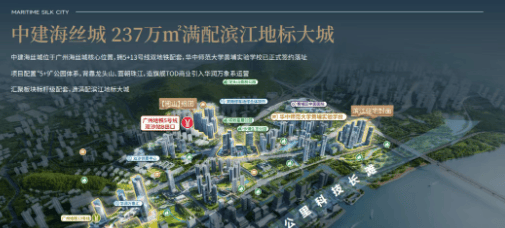 中建海丝城位于广州市黄埔区,是一个规模宏大的综合性住宅项目。由中建八局和知识城集团共同打造,总投资约289.3亿元,总建筑面积高达约240万方。项目不仅拥有稀缺的南向江景资源,而且靠近珠江,有望发展成为滨江豪宅。