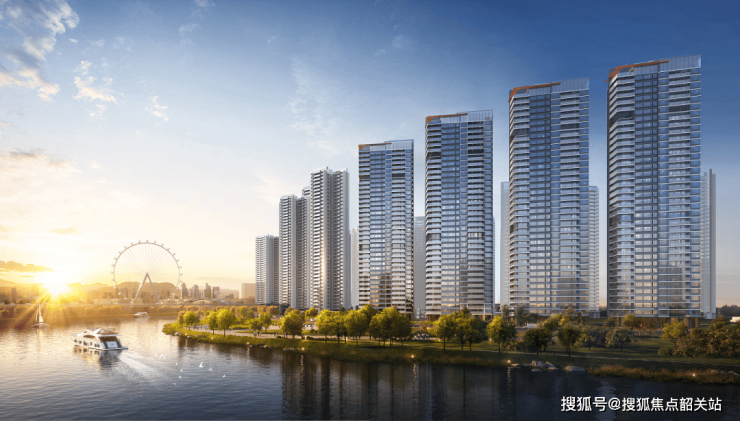 从外立面设计来看,项目汲取全球地标建筑灵感,采用世界级审美的立面风格。鎏金天际塔冠借鉴中国传统建筑屋顶和帝王冠冕造型,简约线条、通透玻璃幕墙搭配铝合金装饰线,呈现高级简洁又有韵律的流线。为彰显江景及南向采光,4栋约120米超高建筑一字排开,拥有更大窗墙比、更高级配色和细腻质感,实现约270°看江采光。建筑腰线取意「水系环绕,玉带环腰」,展示国际极简美学与艺术感。