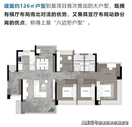 全南向户型:76㎡三房、89㎡3+1房、125㎡四房,得房率超85%。