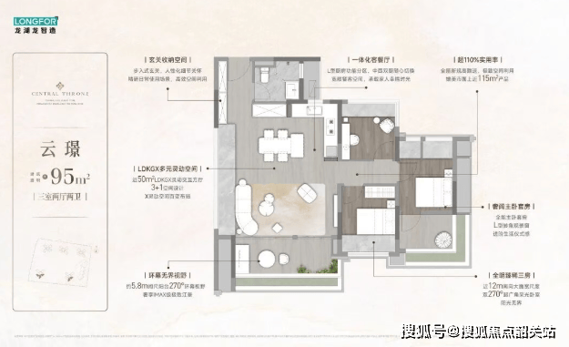 户型是居住体验的核心,龙湖亚伦·央璟颂聚焦高端改善型家庭的需求,打造建面约95–139㎡低密环幕瞰江奢宅,经开发商官方认证,户型设计充分考虑了采光、通风、视野、实用性等多个因素,得房率普遍超110%,部分达130%,空间灵活实用,适配不同家庭的多元化需求。
