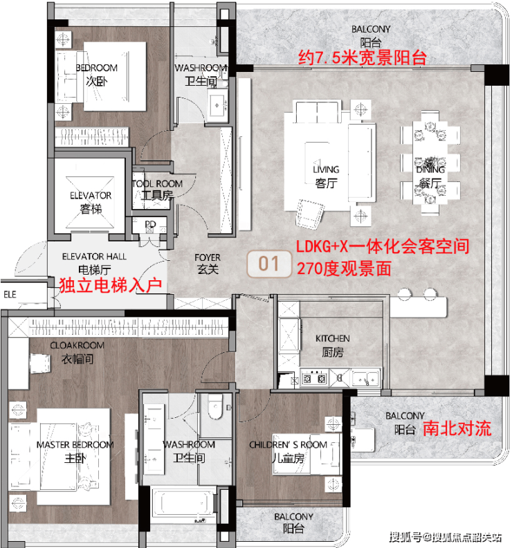 核心亮点2:南北双阳台,7.5米超大阳台环抱客厅。户型配备南北双阳台,其中南侧阳台长达7.5米,超大阳台环抱客厅,视野开阔,可俯瞰一线河景,日常可在这里喝茶、休憩、晾晒、观景,甚至可以打造一个小型花园,满足业主的休闲需求;北侧阳台连接厨房,可用于储物、晾晒,功能分区明确,实用性强。