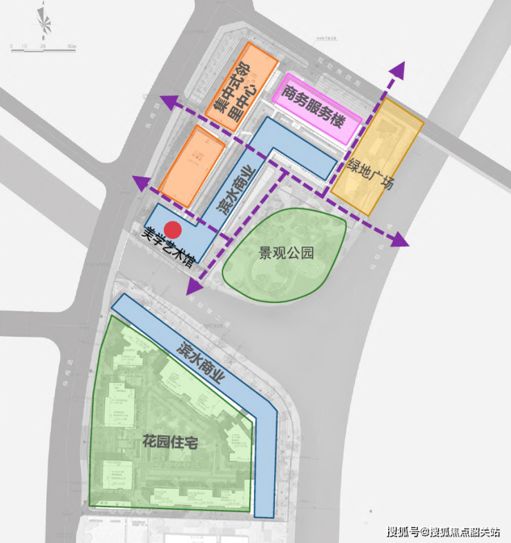 地块划分:项目划分为南北两大地块,北地块为商业兼容文化活动设施、通信及服务设施用地,建筑密度约为40%,绿地率≥30%;南地块为二类居住兼容商业用地,建筑密度约为30%,绿地率≥35%,居住与商业分离,既保证了居住的静谧性,又能满足日常购物需求。