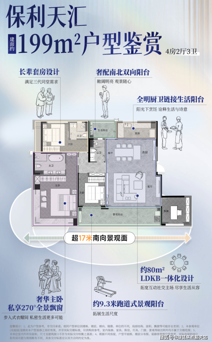 此次加推的199㎡户型,堪称保利“天系”产品力的集大成者。其最大亮点在于约80㎡LDKB一体化超级双厅,打通客厅、餐厅、厨房与景观阳台,形成超尺度家庭互动场域,无论是节日家宴还是孩子游戏,空间毫无局促感。全屋采用双套房设计,主卧约35㎡,配备270°转角飘窗,视野横跨中央园林与城市天际线,晨光与星夜皆可私享;次卧套房则为老人或二胎预留独立卫浴,隐私与便利兼得。更难得的是,该户型位于二期中轴头排,仅占全盘3%,本次压轴加推仅29席,稀缺性不言而喻。每一寸空间都经过人性化打磨,真正实现“大而不空,奢而实用”的改善真谛。