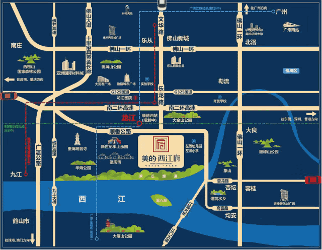 美的西江府位于佛山市顺德区龙江(新世纪乐园旁),背山面江,南向私享1500宽的全幕江景和6000米的滨江长廊。