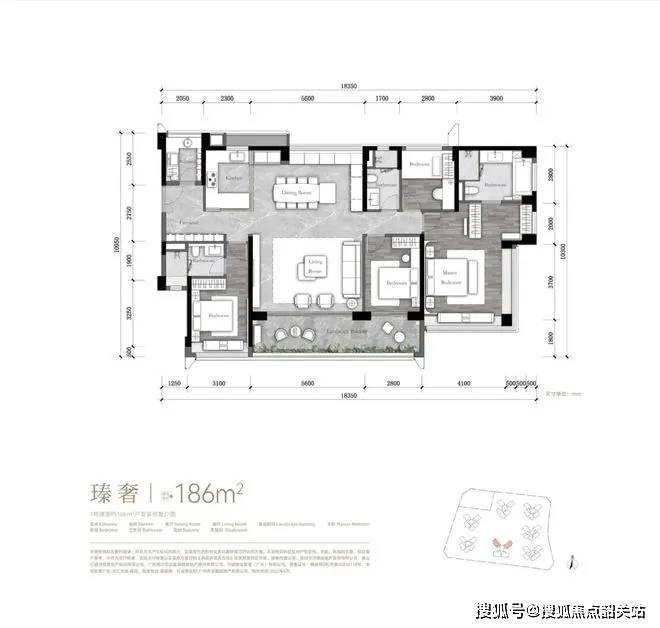 186㎡四房三卫:18.3米奢幕视野+80㎡多功能巨幕宽厅,LDKB洄游动线+40㎡总统套房主卧,正南向户型享一线河涌景观。