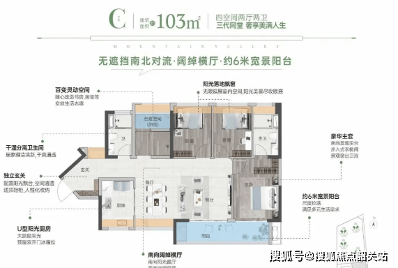 103㎡ 4房2厅2卫:南北通透,灵动户型设计充分利用每一寸空间,配备超6米宽景阳台,享受绝佳景观视野,独立入户玄关保证私密性,使用率约为94%。