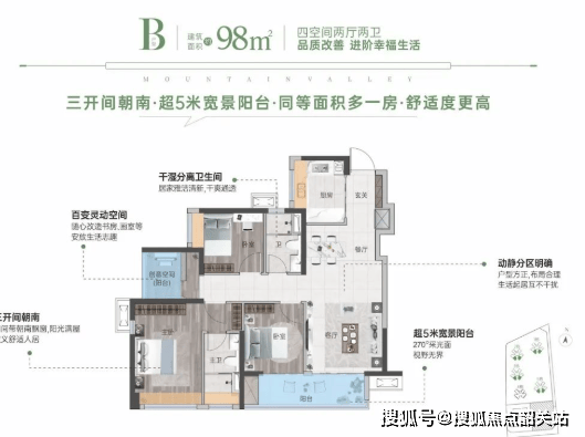 98㎡ 4房2厅2卫:户户朝南,拥有超5米宽的大阳台,通风采光极佳,主卧套房宽敞明亮,整体使用率超过90%。
