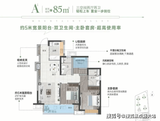 85㎡ 3房2厅2卫:南向设计,带主套,配备约5米宽大阳台,视野开阔,U型大厨房布局合理,使用率高达约90%。