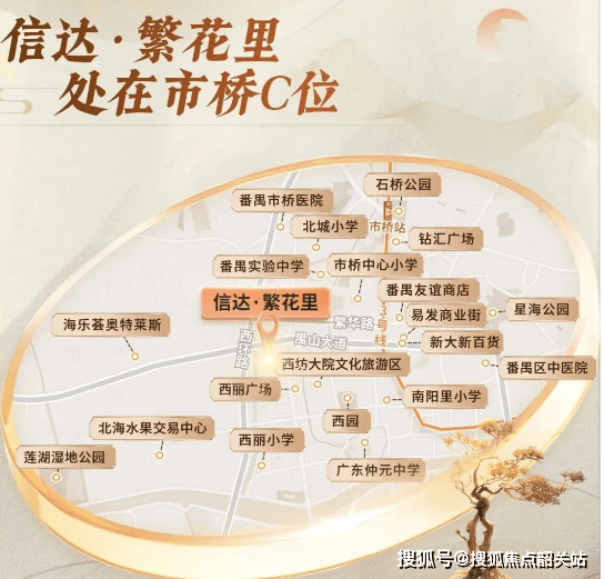 信达・繁花里地处番禺禺山大道南侧,占据市桥老城核心位置,周边 20-30 年成熟小区密集,烟火气息浓厚。交通方面,项目步行约 1.7 公里可抵达地铁 3 号线市桥站,1 站直达长隆或番禺广场,换乘 7 号线 2 站即达万博 CBD,8 站可至珠江新城,轻松融入广州主城生活圈。更值得期待的是,规划中的地铁 26 号线有望在禺山大道与西环路交界处设站,未来项目或将成为 “地铁上盖物业”,出行便捷度再升级。此外,项目临近禺山大道、西环路两大主干道,接驳东新高速、新光快速,自驾可快速通达荔湾、海珠、天河等区域,多维交通路网满足不同出行需求。