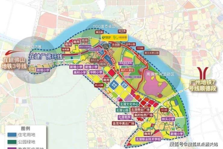 项目片区定位为广州大学城卫星城创新基地、人才集聚小镇;用地布局上主要由二类居住用地、中小学用地、公园用地及城市道路用地四类构成。根据规划,距离项目1公里内有和祐国际医院、九年制规划学校,北滘新城规划1处用地超4万㎡综合体育中心、1处居家养老服务中心、2处农贸市场等公共服务设施。