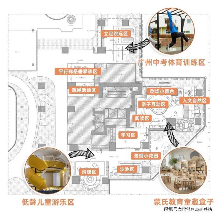 像是针对低龄孩子的攀爬玩乐区、童趣王国,为高年级儿童设置的中考体育训练区、植物科普区等等。更有供年长者休闲、活动的健身设施、棋盘、休闲卡座等户外活动区。