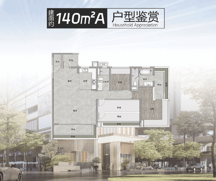 建面约140㎡A户型,更注重居住的功能性与舒适性的平衡,为三代同堂家族量身定制。