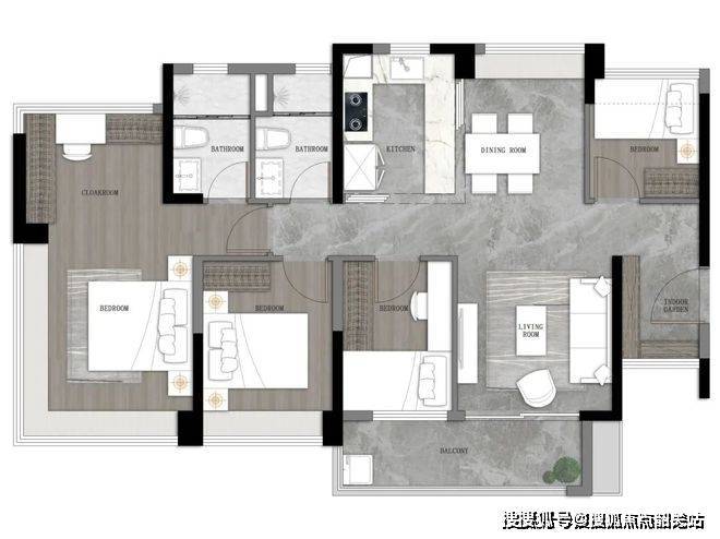 建面约103㎡户型,在入户处新增了一个房间做到四房,布局也变成了横厅布局,南北对流更加通透。