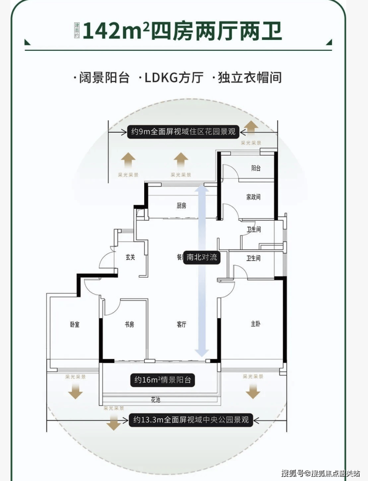 户型设计以全南向、大景观为核心亮点,多数户型实现四开间朝南,采光通风效果极佳,室内空间通透敞亮。其中公园头排户型拥有270°全景视野,将中央公园绿意尽收眼底。175㎡四房户型采用东南朝向设计,客餐厅连通全景飘窗,采光面宽阔,双主套布局兼顾长辈与晚辈居住私密性;全系产品采用专梯专户设计,入户即享独立玄关空间,提升归家仪式感。户型图清晰展现空间尺度、功能分区与景观视野,动静分区明确,起居区与休憩区合理分隔,既满足家庭聚会、社交会客需求,也保障私密休息空间。项目甄选优质建材,搭配现代简约建筑美学,结合低密规划与宽绰楼距,在居住舒适度、实用性与景观价值上实现平衡,契合当下改善置业核心标准。