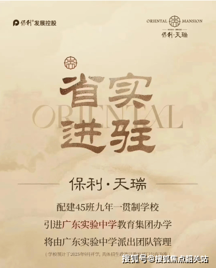 尤为值得一提的是,配建的 45 班公办九年一贯制学校已官宣引进广东实验中学教育集团办学,由广东实验中学派出团队管理。这不仅在天河楼盘配建公办学校引进省市属品牌办学中尚属首次,对天河教育意义重大,更是板块及保利天瑞的重磅利好。学校预计 2025 年 9 月开学,具体招生政策以当年教育部门公布为准。基于其优越的地理位置,保利天瑞极易吸引珠城、琶洲、金融城的优质人群以及汇景新城的置换人群,业主圈层实力强劲。