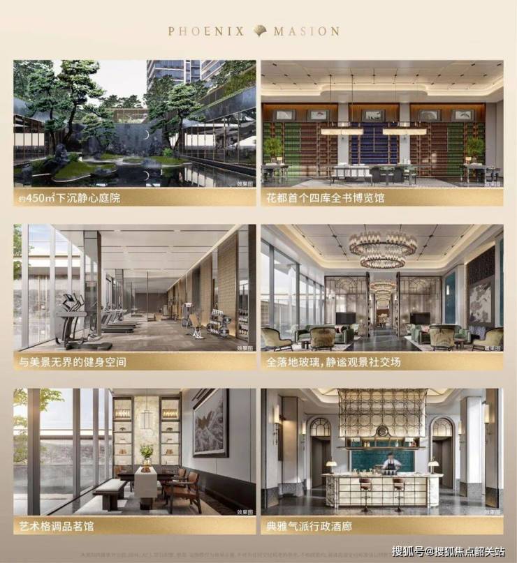 项目打造了约2000㎡的下沉式酒店会所——凤凰艺境生活馆。这里设计了高尚社交、文化沉浸与休闲松弛三大功能空间。静心庭院让您远离尘嚣,城市会客厅让您结交邻里,行政酒廊让您品味人生,四库全书博览馆让您充实心灵,健身房、瑜伽室让您保持活力,品茗馆让您静享时光。并且,会所前置运营,交房即享受,无需漫长等待。